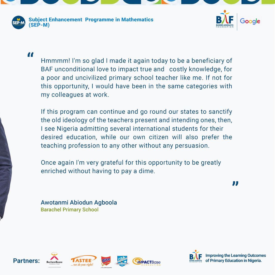 Another beneficiary, Awotanmi Abiodun Agboola, Barachel Primary School has this to say “I'm so glad I made it again today to be a beneficiary of BAF unconditional love to impact true and costly knowledge, for a poor and uncivilized primary school teacher like me😭. If not for this opportunity, I would have been in the same categories with my colleagues at work.Once again I'm very grateful for this opportunity to be greatly enriched without having to pay a dime.”