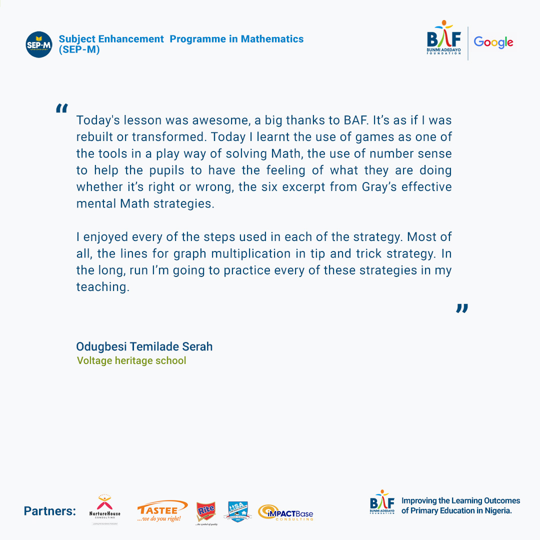 One of the beneficiaries, OdugbesiTemiladeSerah from Voltage Heritage School said “a big thanks to BAF. It’s as if I was rebuilt or transformed. Today I learnt the use of games as one of the tools in a play way of solving Maths, the use of number sense to help the pupils to have the feeling of what they are doing whether it’s right or wrong, the six excerpt from Gray’s effective mental Maths strategies. I enjoyed every of the steps used in each of the strategy. Most of all, the lines for graph multiplication in tip and trick strategy. In the long, run I’m going to practice every of these strategies in my teaching.”