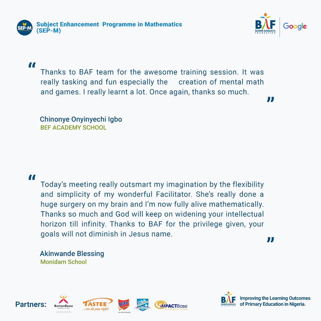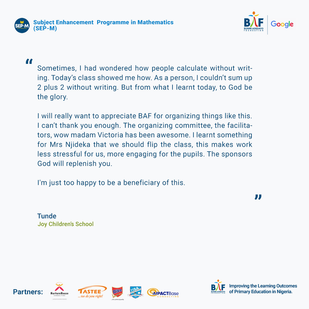 Partner organizations and project beneficiaries of the Subject Enhancement Programme in Mathematics have commended the Bunmi Adedayo Foundation for the education intervention programme, describing it a transformative programme needed across the nation.